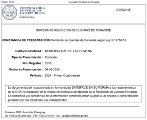 Por este medio informamos que la Municipalidad de la Colmena da cumplimiento a la Resolución CGR N° RES CGR N° 433/2016, por la cual se dispone la actualización de la reglamentación de rendiciones de cuentas e informes a la Contraloría General de la República de los ingresos percibidos y gastos efectuados por los organismos y entidades que reciban, administren o utilicen fondos públicos de recursos provenientes de la Ley N° 4758/12 «QUE CREA FONDO NACIONAL DE INVERSIÓN PÚBLICA Y DESARROLLO (FONACIDE) Y EL FONDO PARA LA EXCELENCIA DE LA EDUCACIÓN Y LA INVESTIGACIÓN».